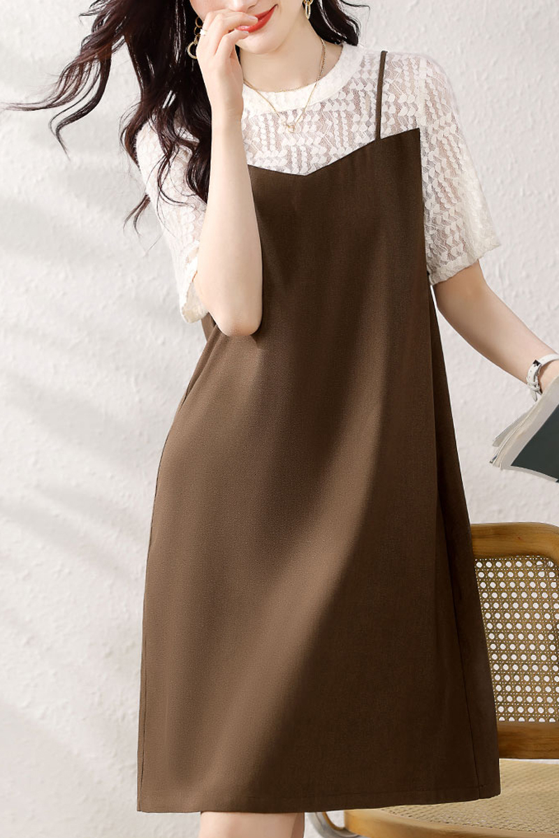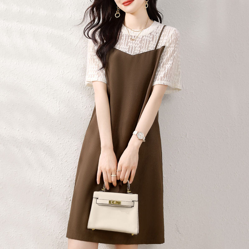 Elegant lace spliced collision color short-sleeved dress