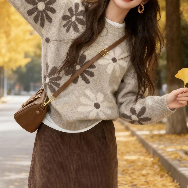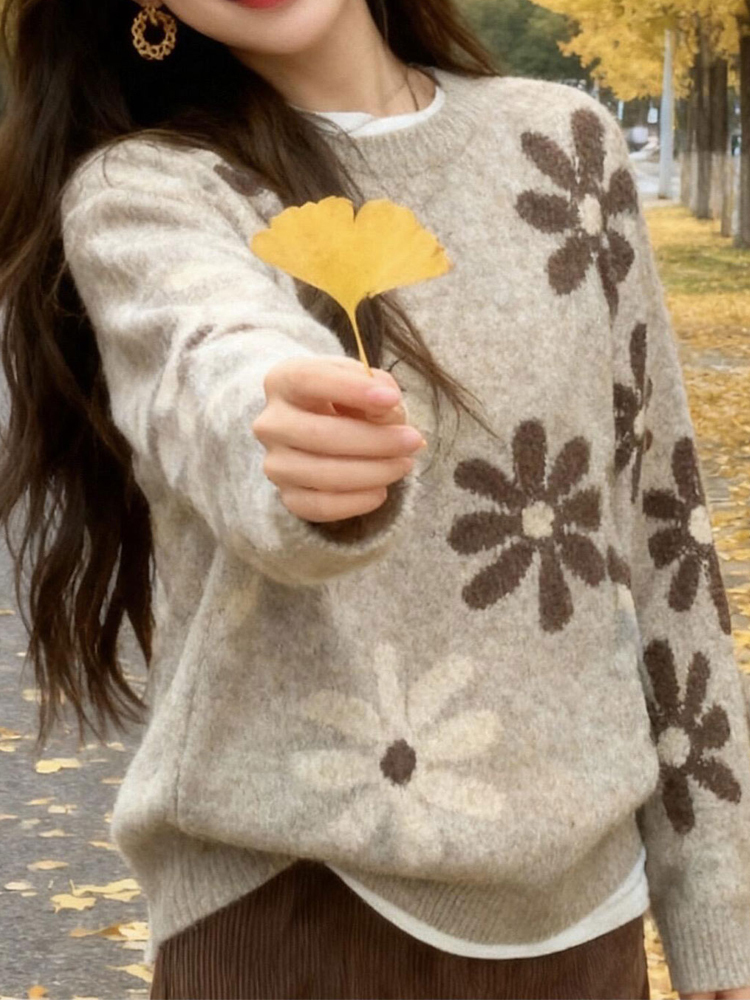 Vintage floral pattern loose pullover autumn and winter sleeves women's sweater