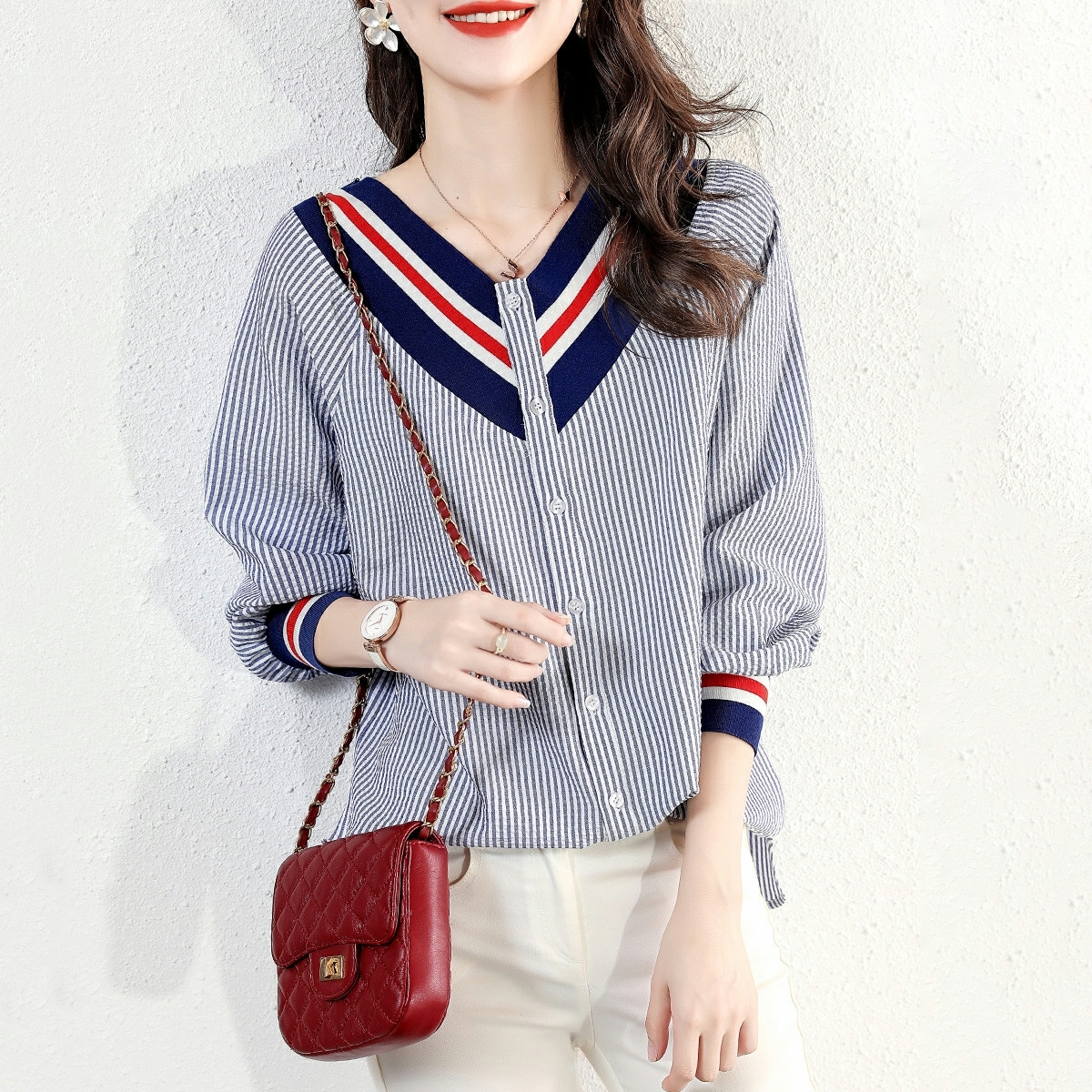 V-collar striped stitched loose long-sleeved blouse