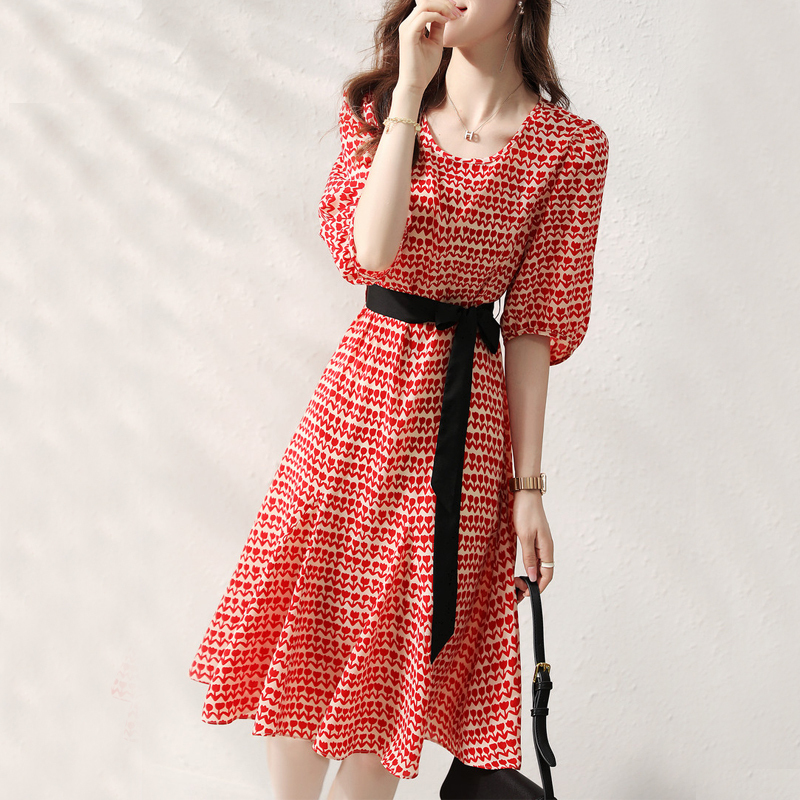 Geometric safflower waist short-sleeved dress