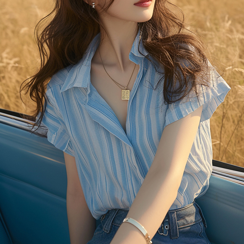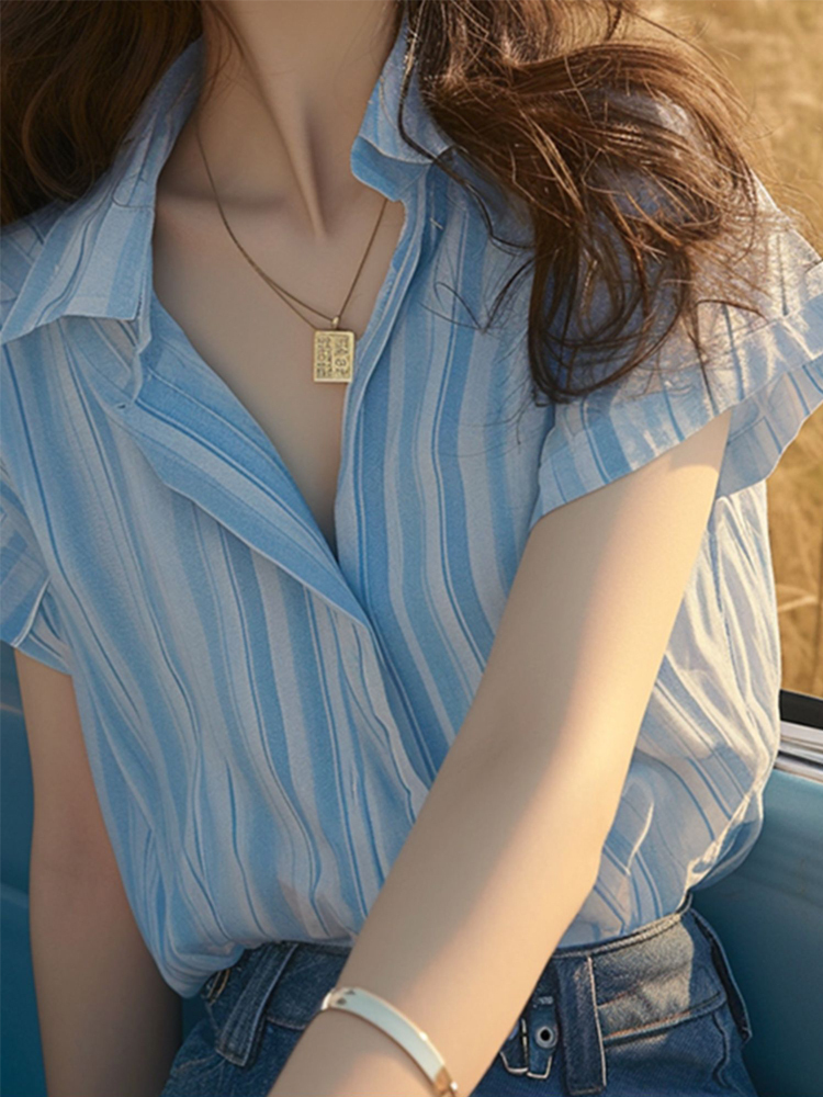 Blue and white vertical stripe fresh short-sleeved blouse