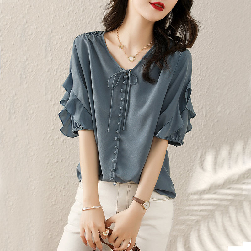 Lotus leaf edge splicing design sensitive button women's shirt