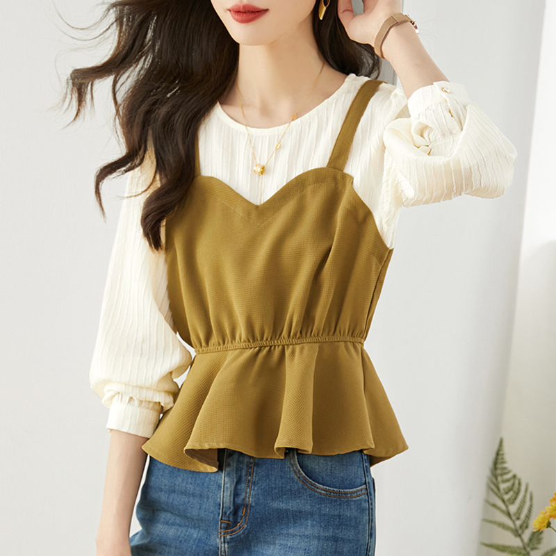 Waist-folded ruffle short fake two-piece sleeve shirt