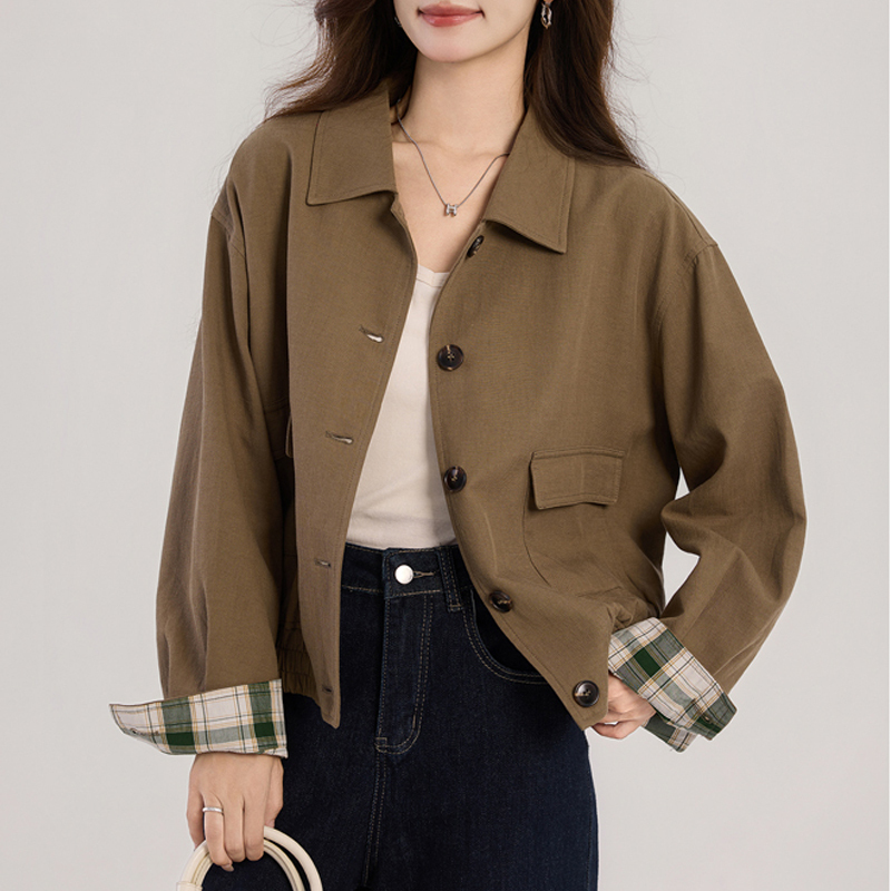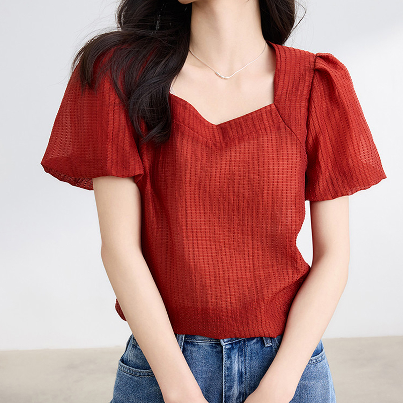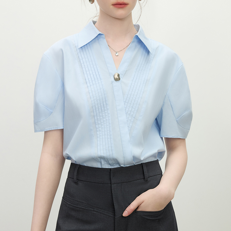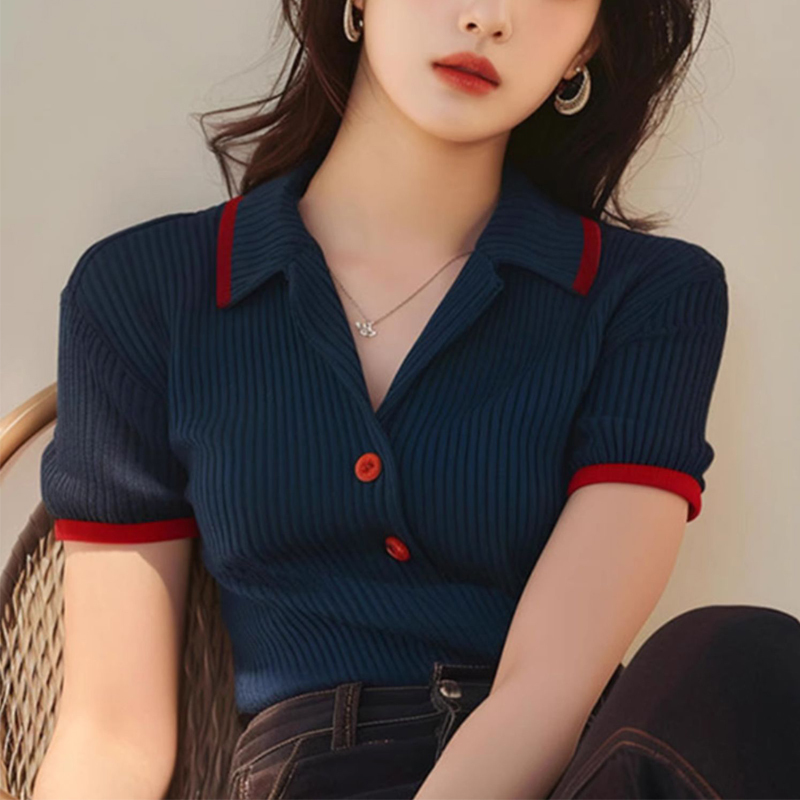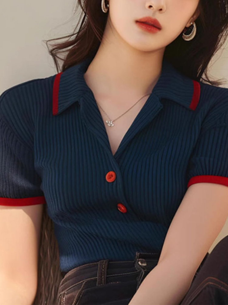 Contrast-colored lapel short-sleeved blouse for slimming summer sweater