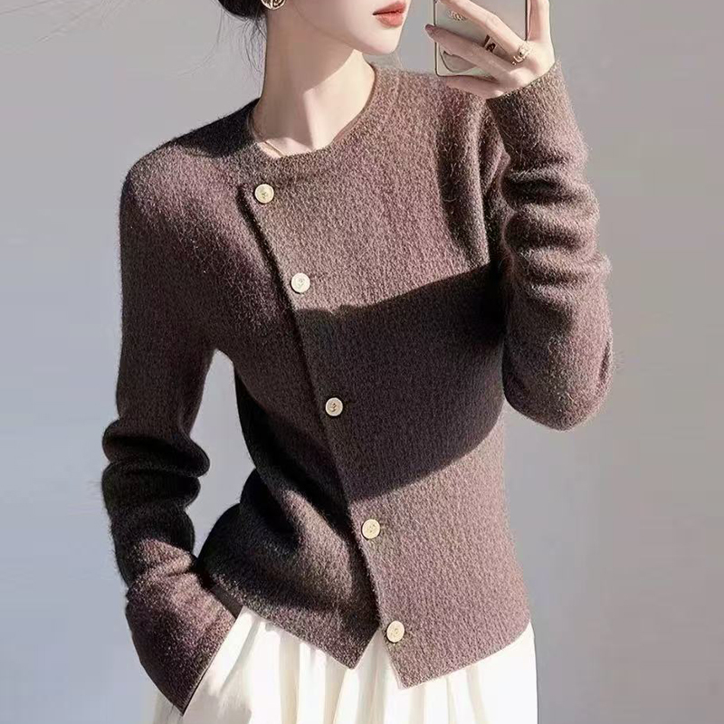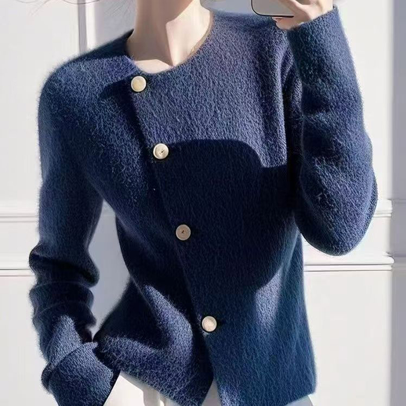 Design Asymmetrical women's sweater with slanted plumes and breasted placket