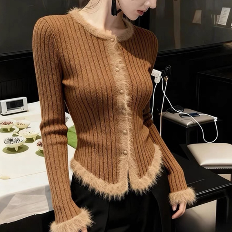 Autumn and winter retro coffee color pit strip with rough edges and waist sleeves women's sweater