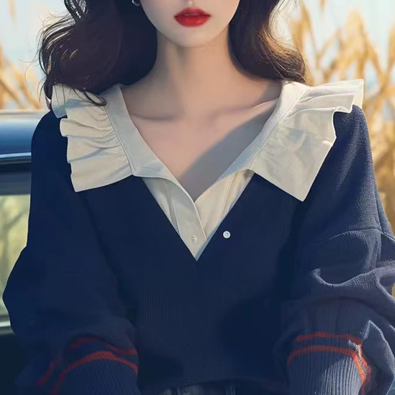 Stitched fake two-piece set, lazy loose pullover, autumn and winter women's sweater