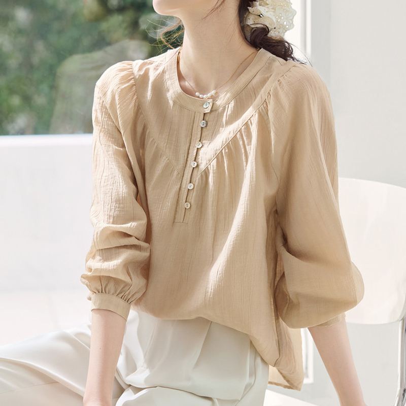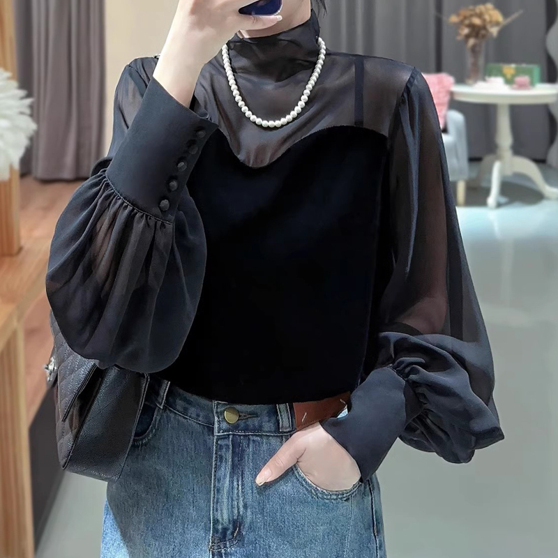 Velvet stitching, slightly transparent loose stand-collar, pullover sleeves, blouse