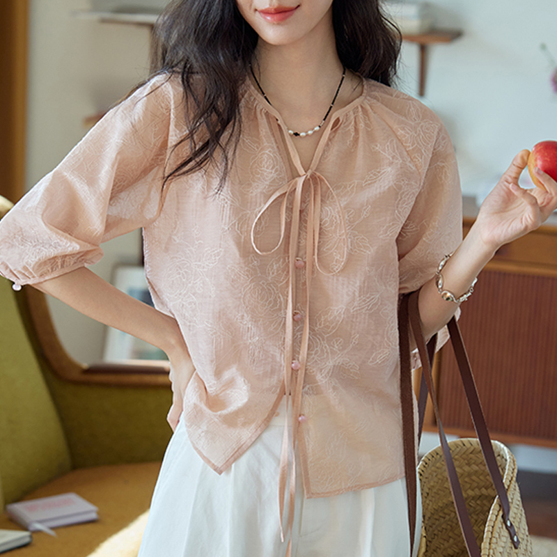 Bow tie small V-neck black elegant slightly sleeve sleeve shirt