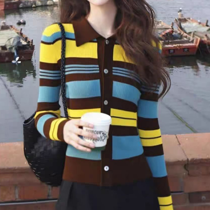 Lazy style striped loose horn button high-end sleeve women's sweater