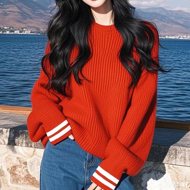 Relaxed red contrasting cuffs pullover loose autumn and winter sweater
