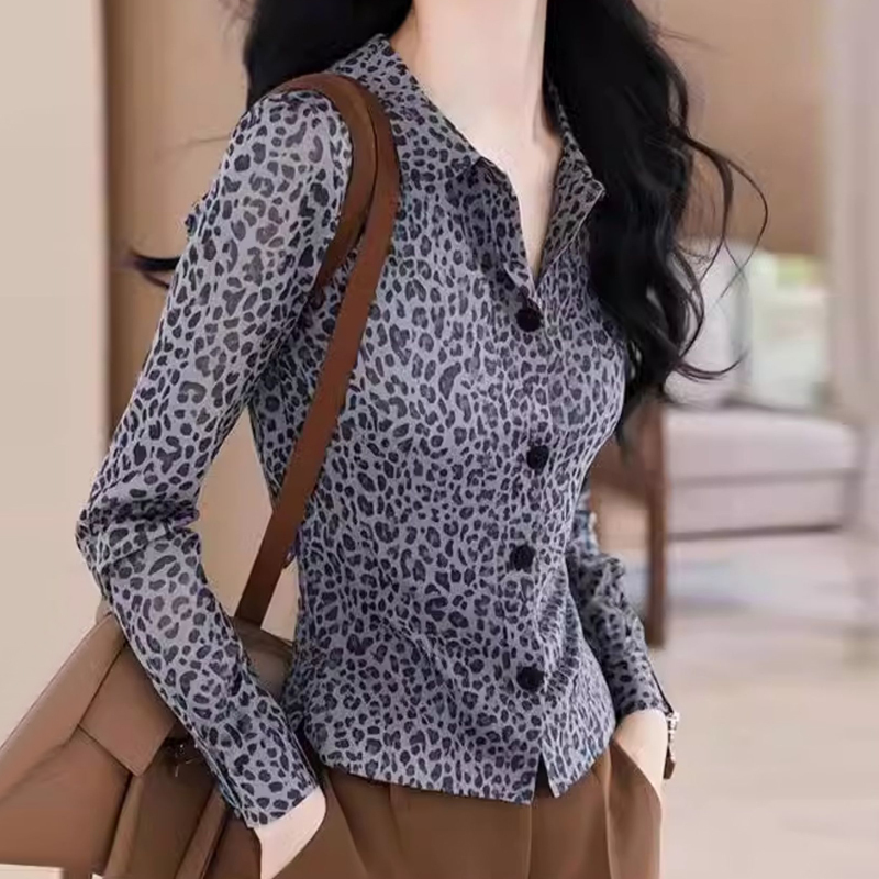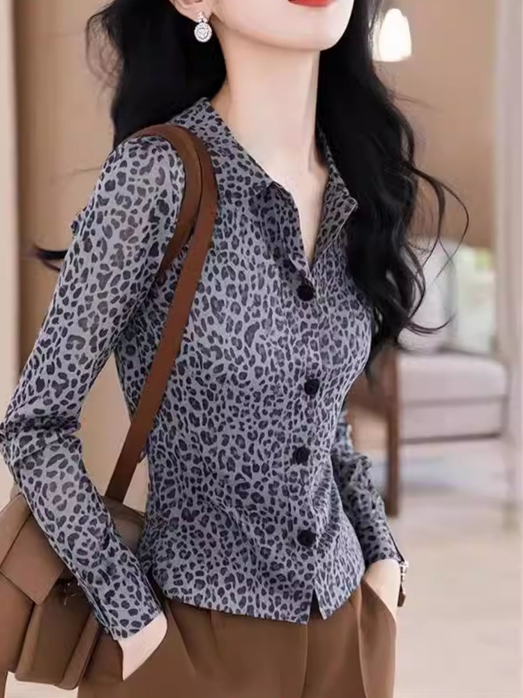 French new style leopard-print style waist sleeves women's shirt
