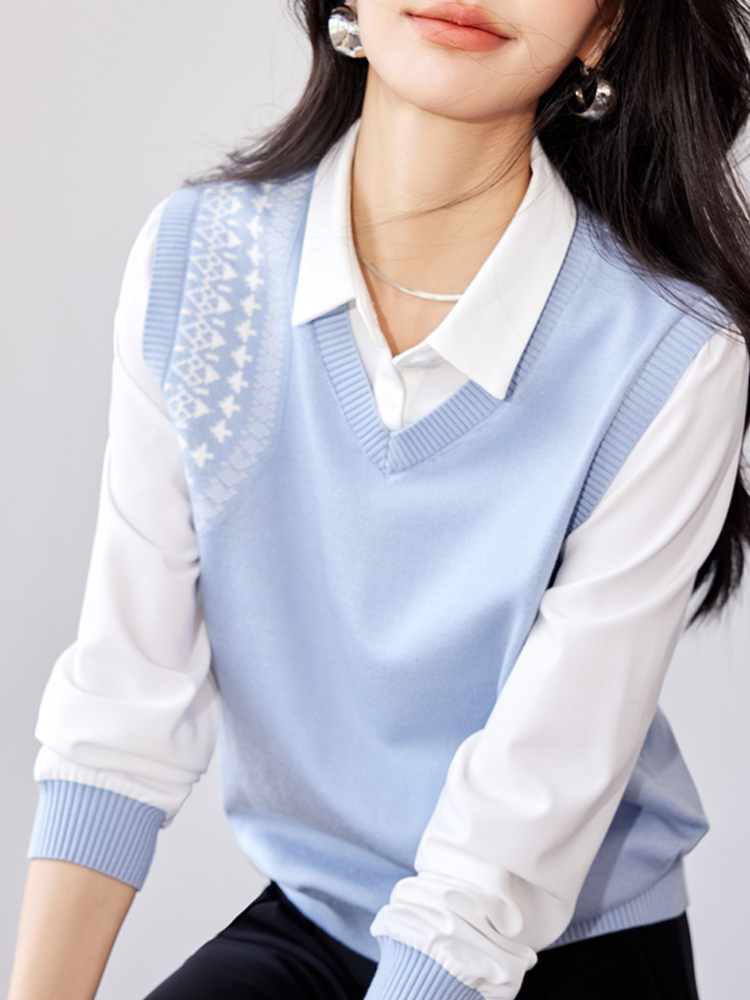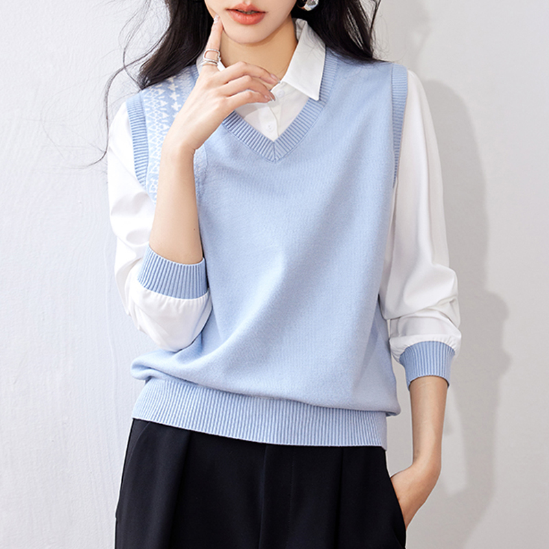 Stitching knitted fake two-piece long-sleeved blouse