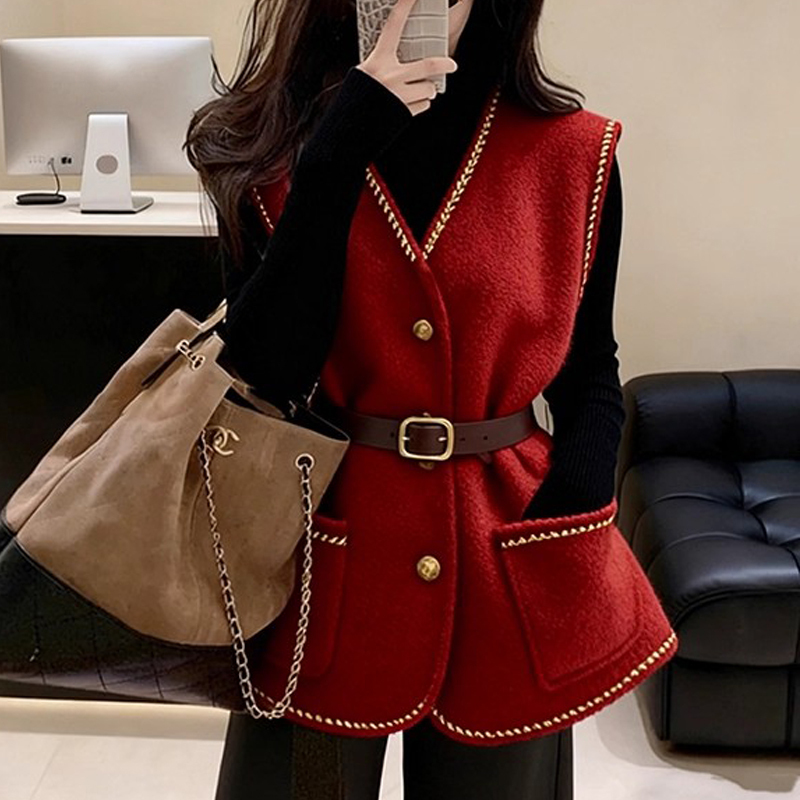 Red contrasting color waist short women's vest autumn and winter sleeveless coat top