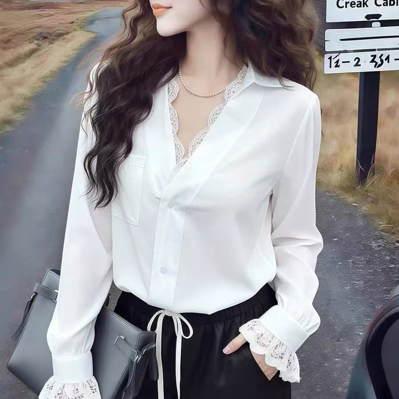 Spring lace splicing V-neck elegant new white sleeve blouse