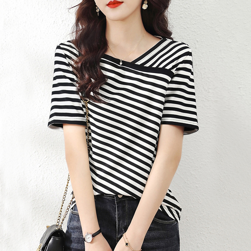 New style elegant lace neckline striped sleeves women's T-shirt top