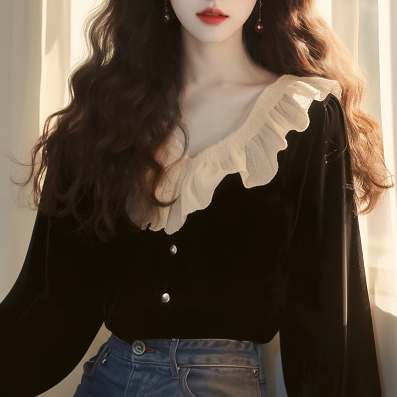Autumn and winter black silk velvet waist top elegant sleeve women's shirt