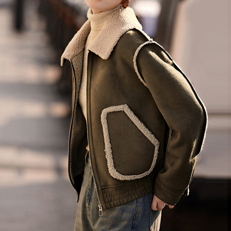 Contrast-color splicing green coffee plush reverse leather short coat