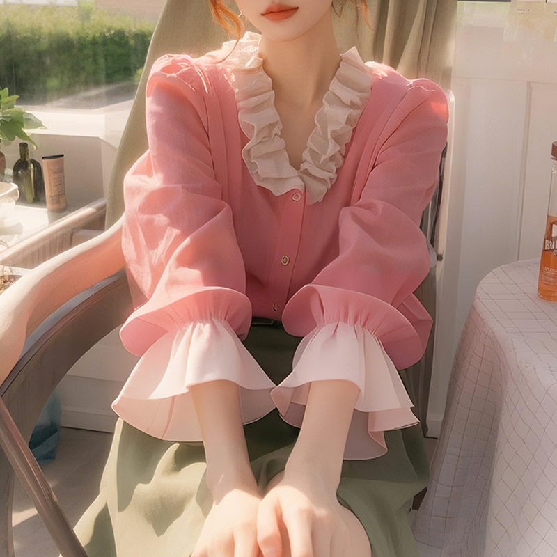 Design, age-reducing collar with ruffles, contrasting color, pink sleeve shirt