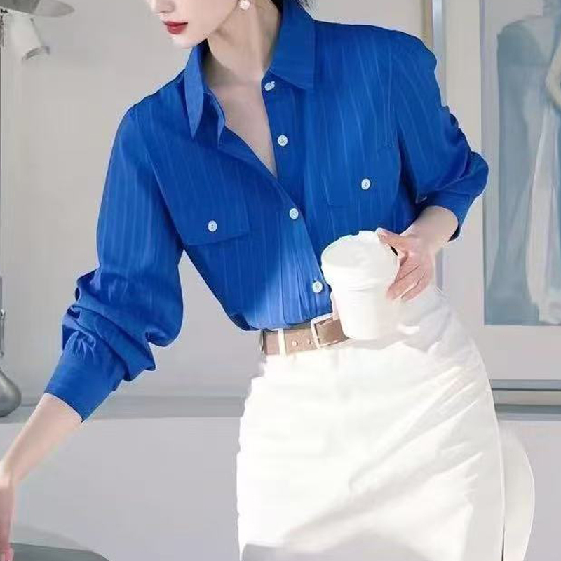 Vertical stripe Klein blue loose commuting spring and autumn sleeves blouse