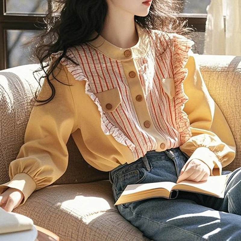 Yellow contrast stripe stitching fungus edge loose sleeve shirt