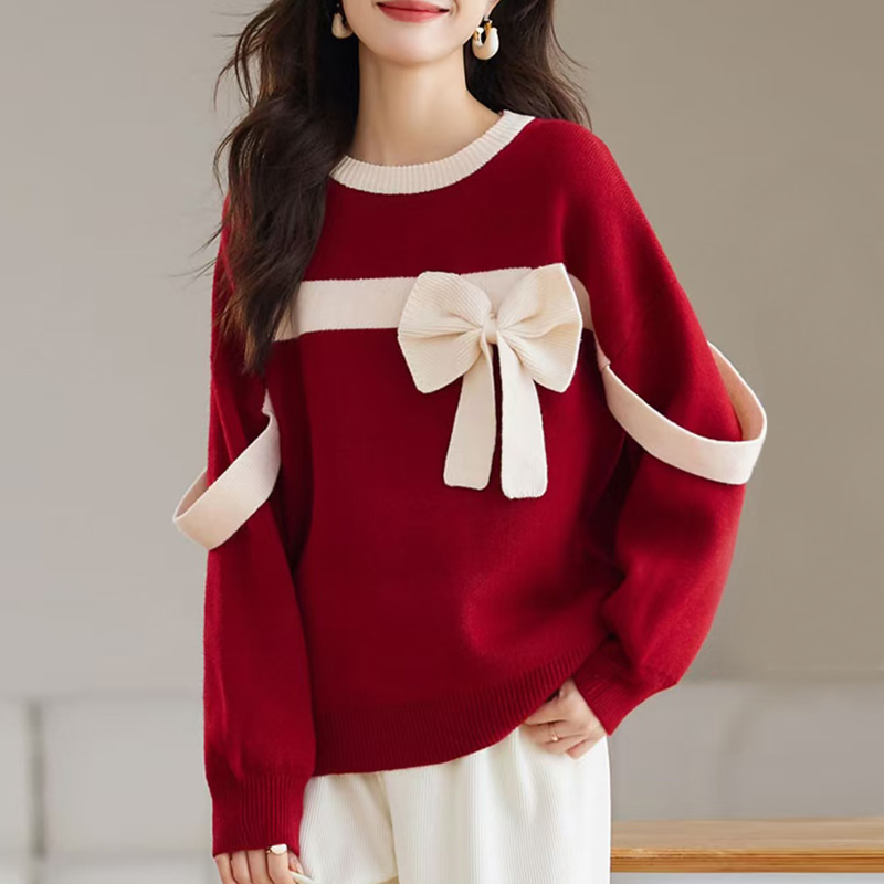 Red collision bow decoration pullover loose sleeves women's sweater