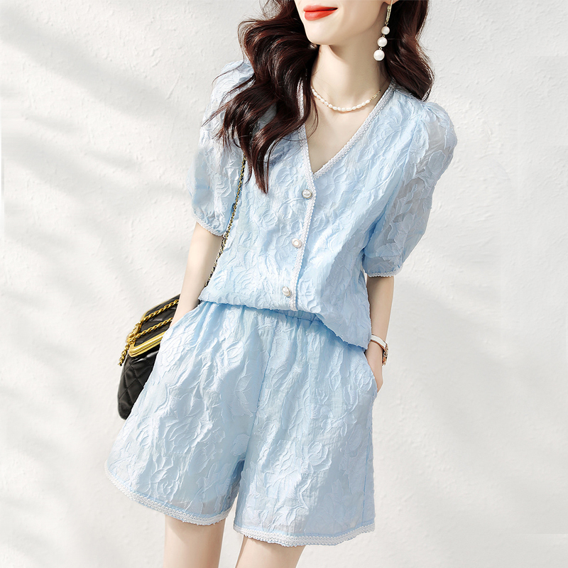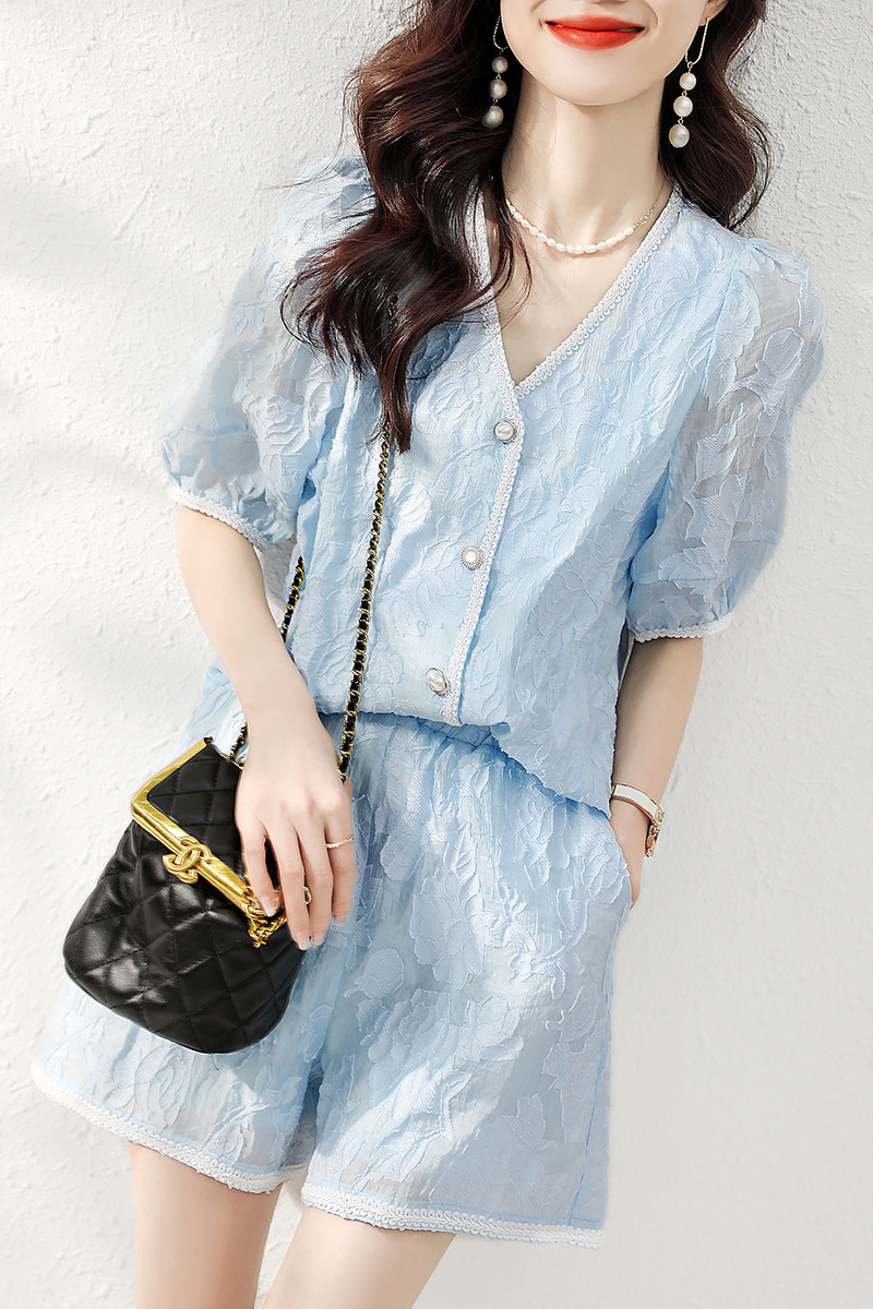 Small fresh lace V-collar blue two-piece suit