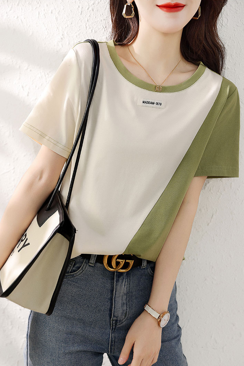 Color spliced T-shirt blouse for ladies with short sleeves