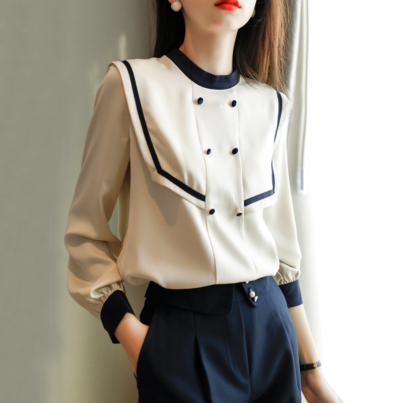 Design sense of double-breasted color spliced blouses