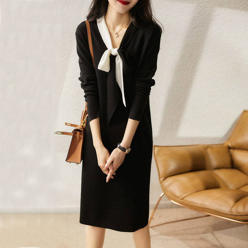 Black-and-white bow tie with slim knitted dress