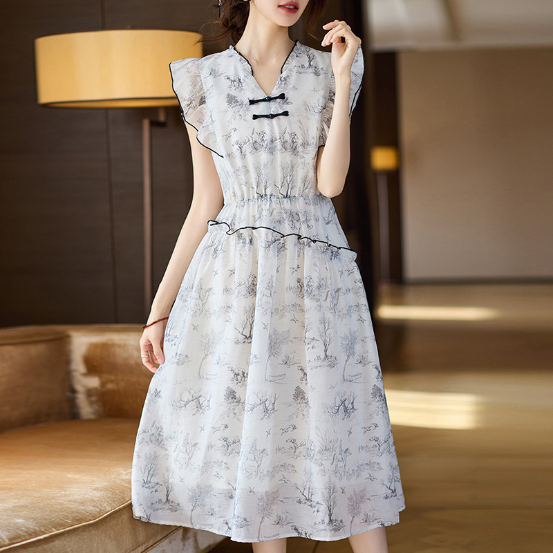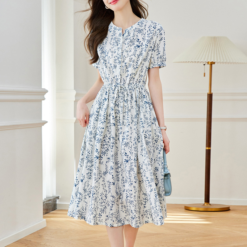 Blue and white porcelain retro high-rise big swing skirt short-sleeved dress