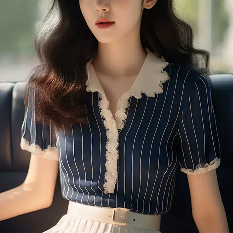 Contrasting lace blue vertical stripe short-sleeved blouse