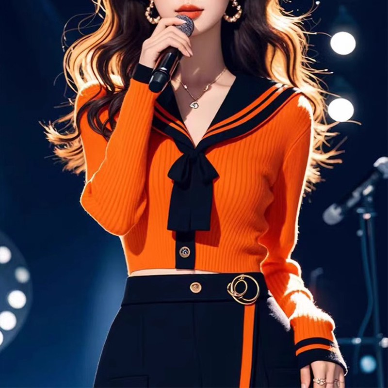 Bow tie and contrasting collar orange short women's sweater