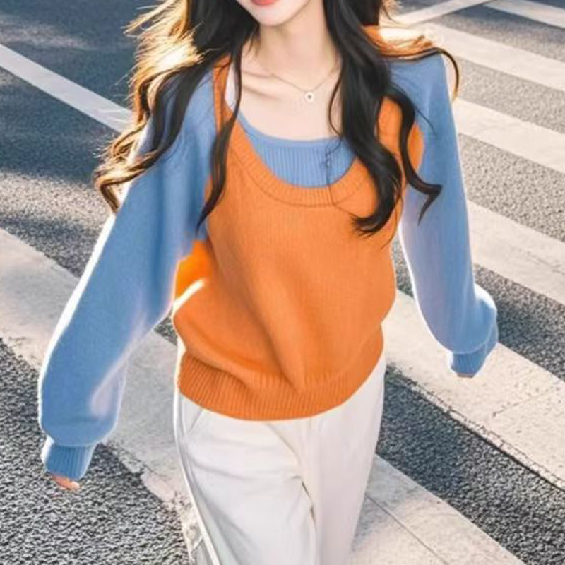 Fake two-piece pullover blue and pink contrasting pullover sweater