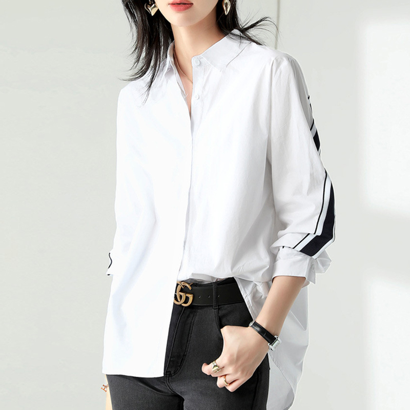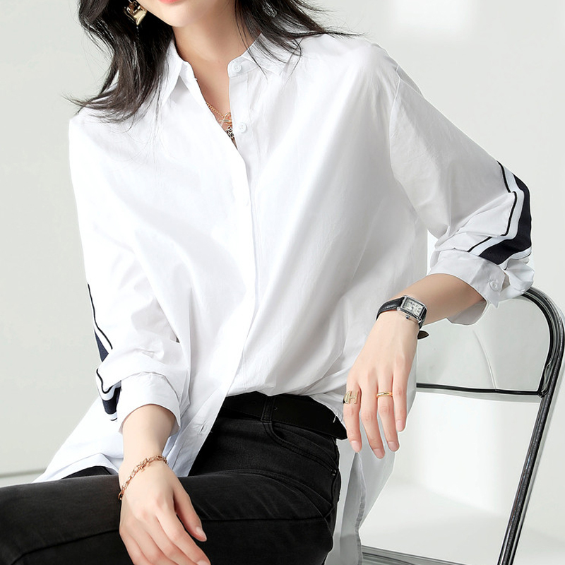 Color ribbon spliced white long-sleeved shirt