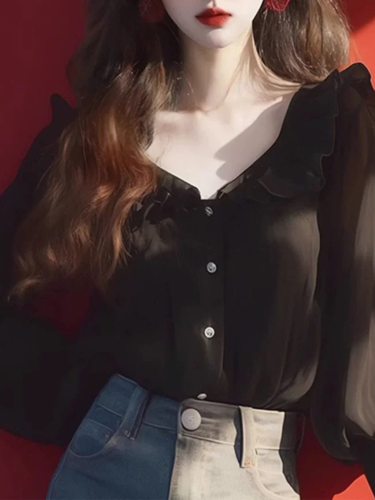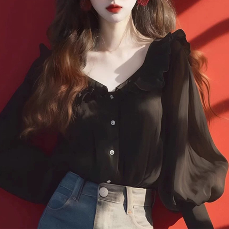 New style black lotus leaf collar lantern sleeves women's shirt