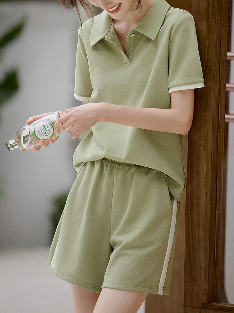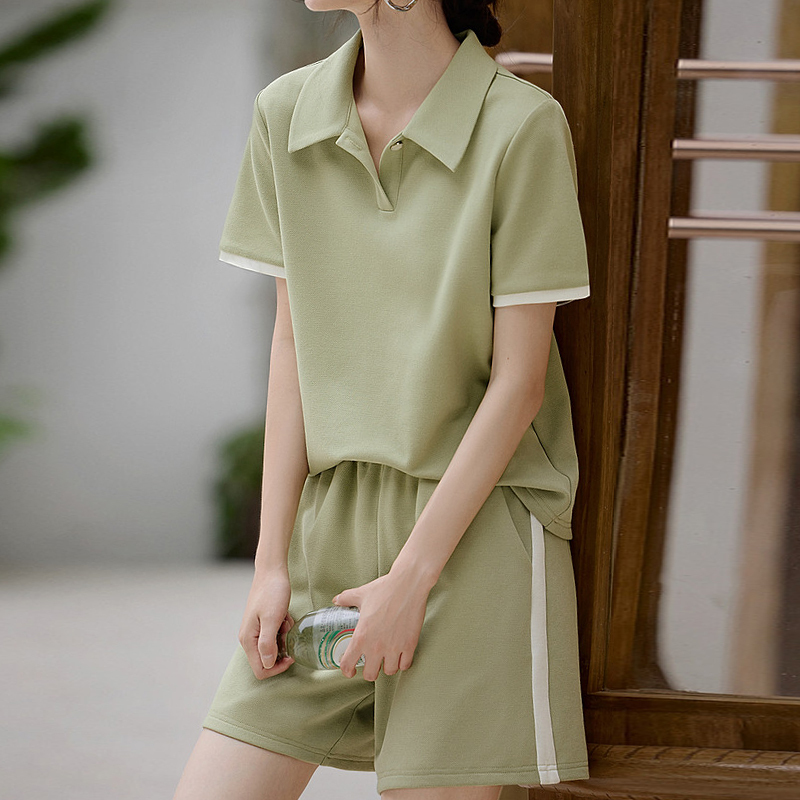 Contrasting color restoration lapel short-sleeved T-shirt and shorts two-piece set