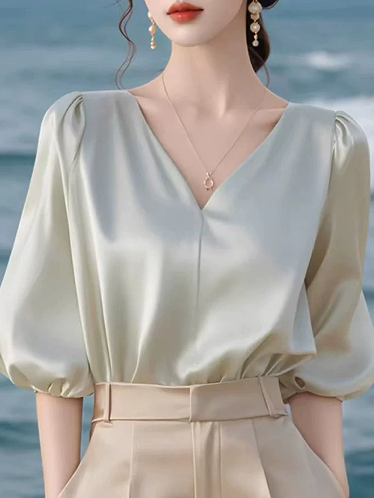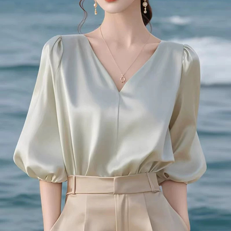 Temperament simple commuting V-neck pullover mid-sleeve summer blouse