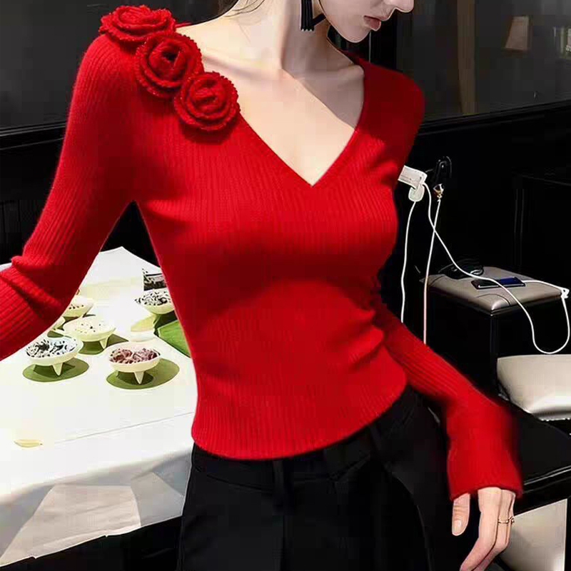 Red three-dimensional flower decoration, waist and slimming sleeve sweater