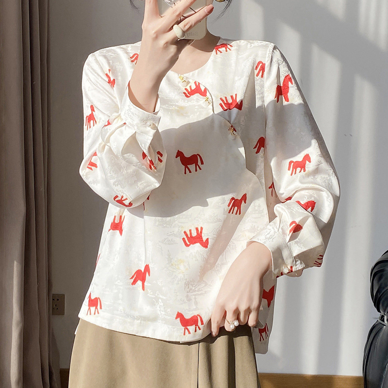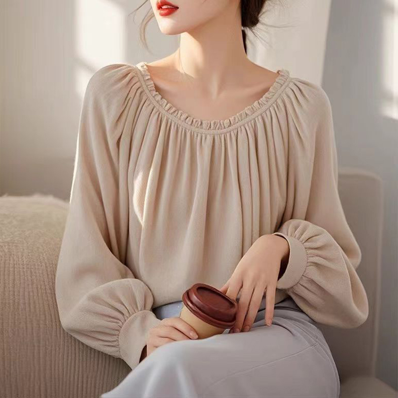 Contrasting colors and elegant silk new apricot pullover sleeves women's shirt