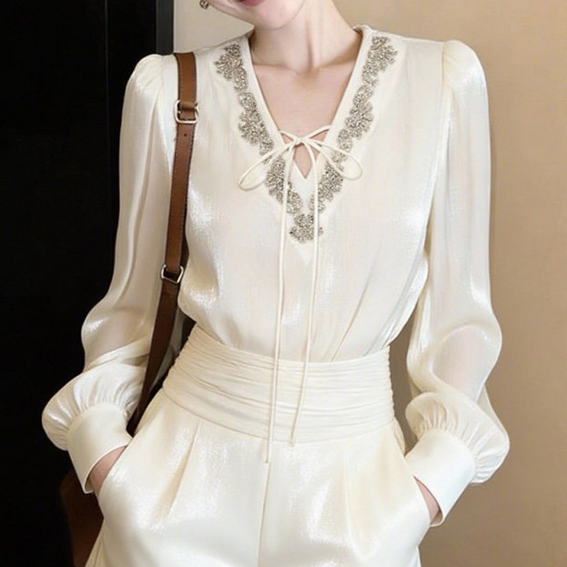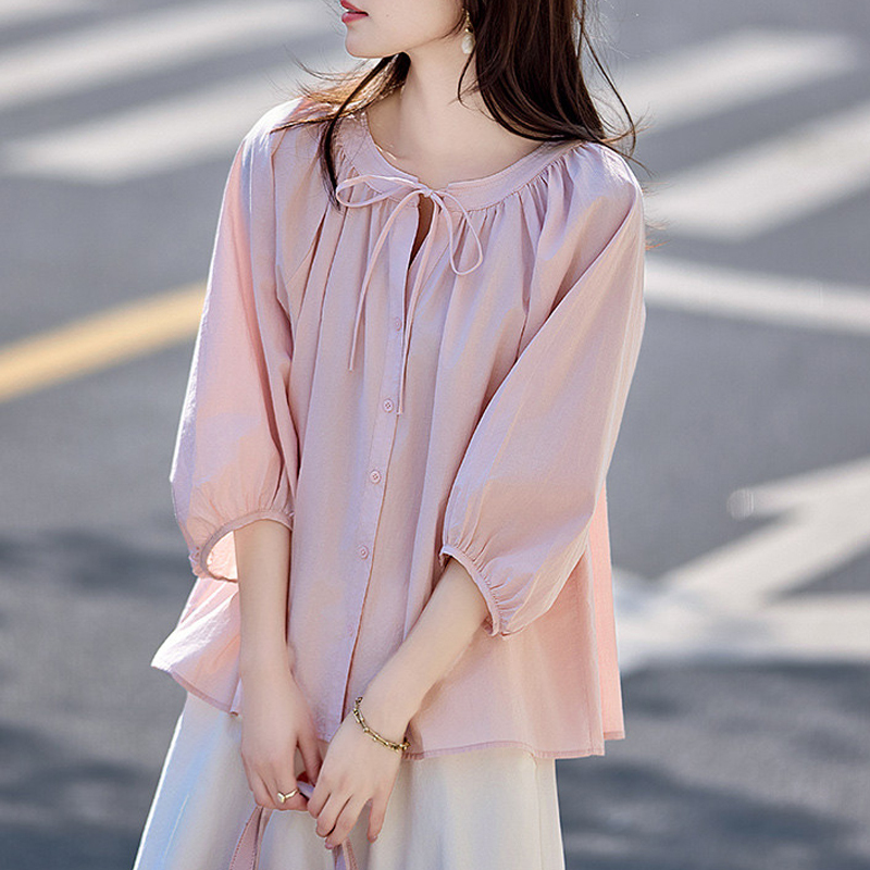 Lace-up small V-neck loose seven-quarter sleeve early autumn women's shirt