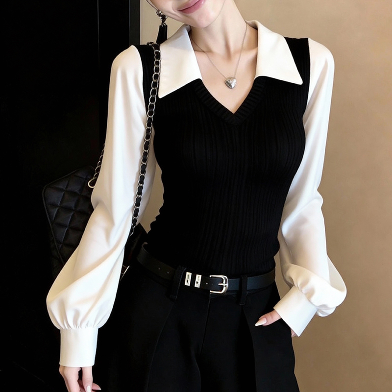 Black and white contrast color stitching small V-neck lapel pullover sleeves blouse