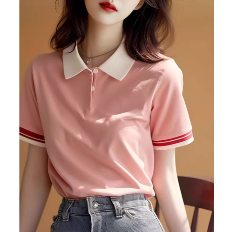 Contrast-color cuff lapel short-sleeve knitted blouse