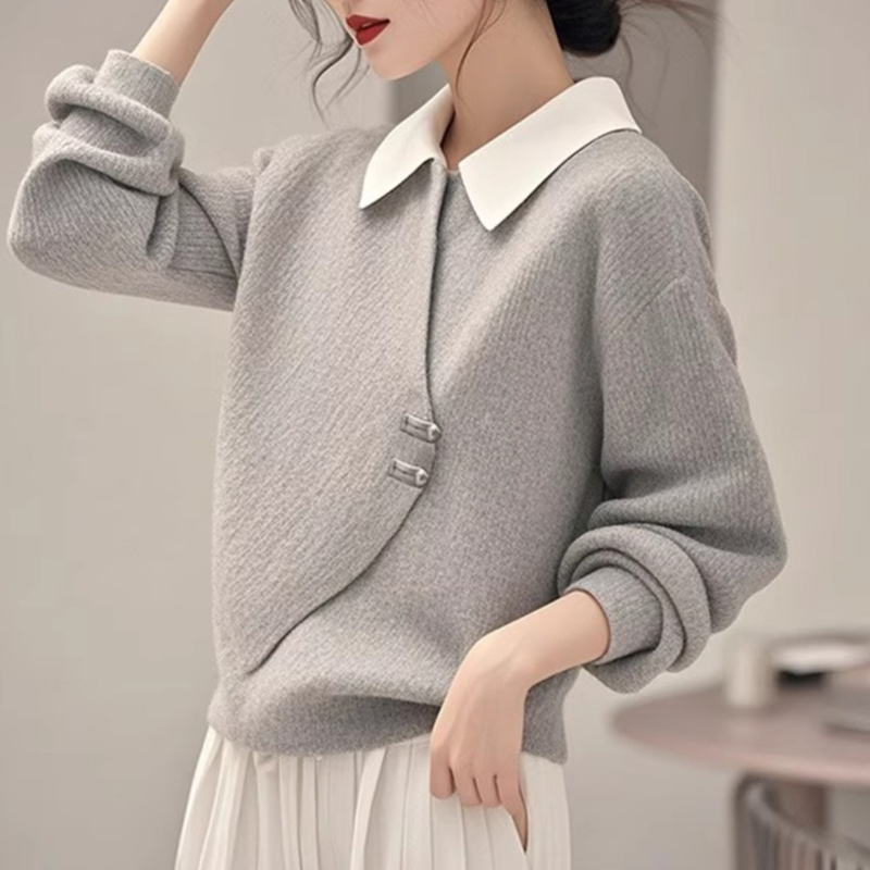 Design fake two-piece gray loose women's knitted tops