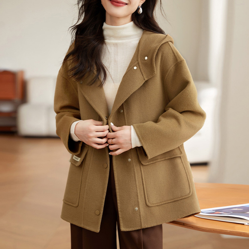 Winter new hooded camel double pocket women's coat