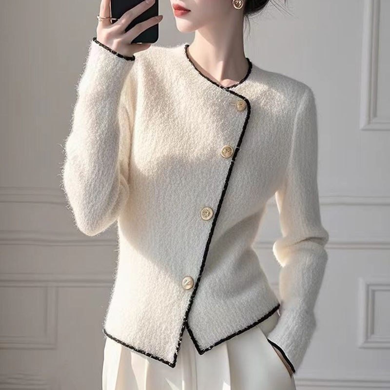 Design diagonal breasted rice apricot autumn and winter sleeves women's sweater top