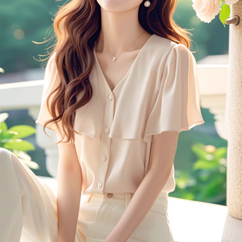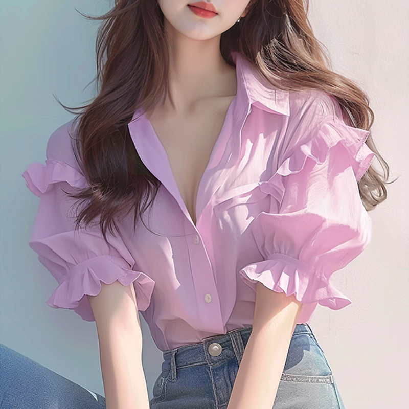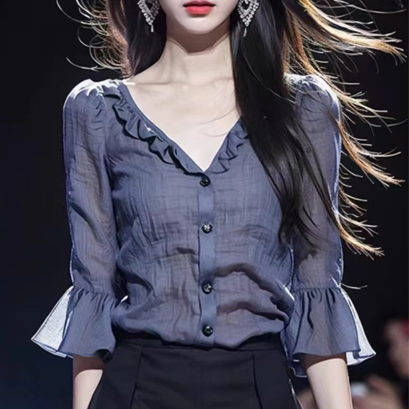 New ruffled V-neck, micro-sleeve, mid-sleeve women's shirt