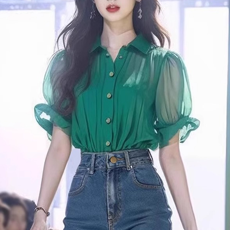 French new style green slightly transparent summer short-sleeved blouse