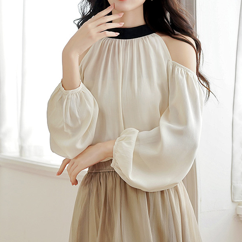 Contrast-colored neckline, strapless design, loose pullover sleeves, women's shirt