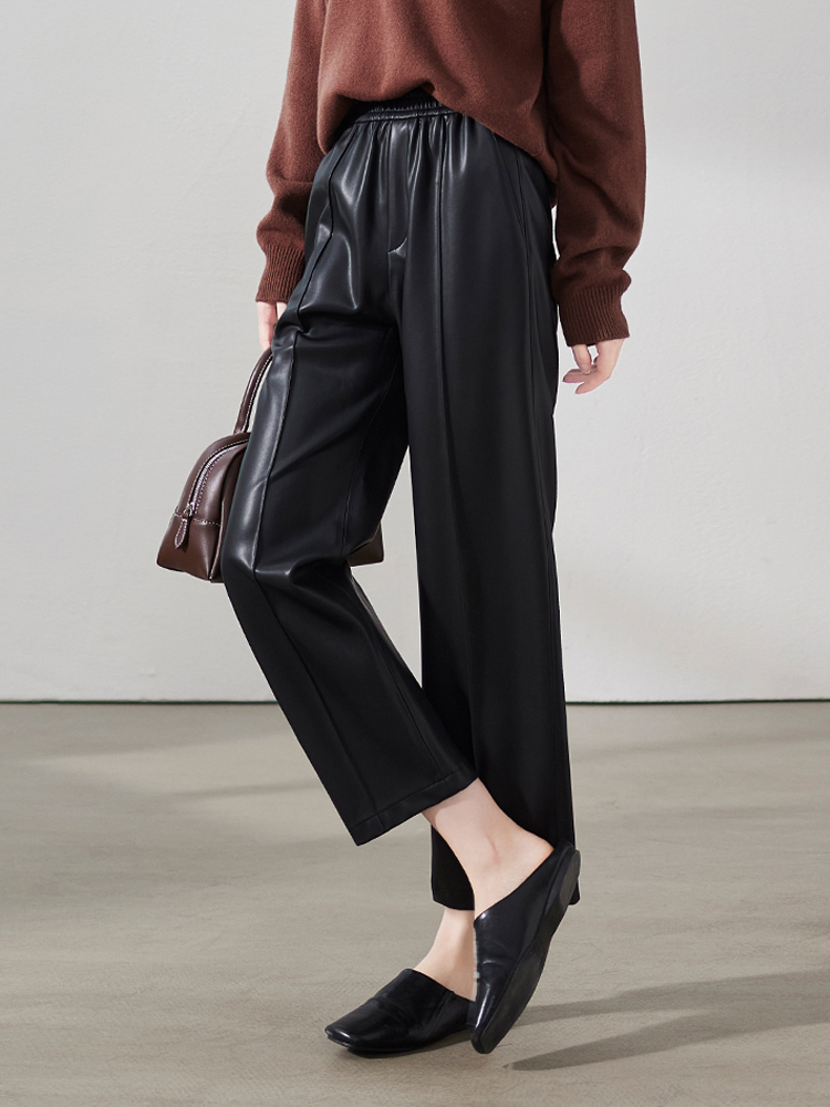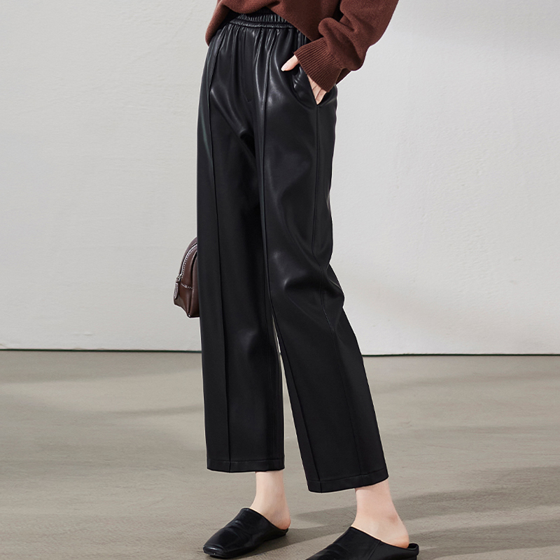 Elastic waist soft and comfortable black straight pants PU women's pants